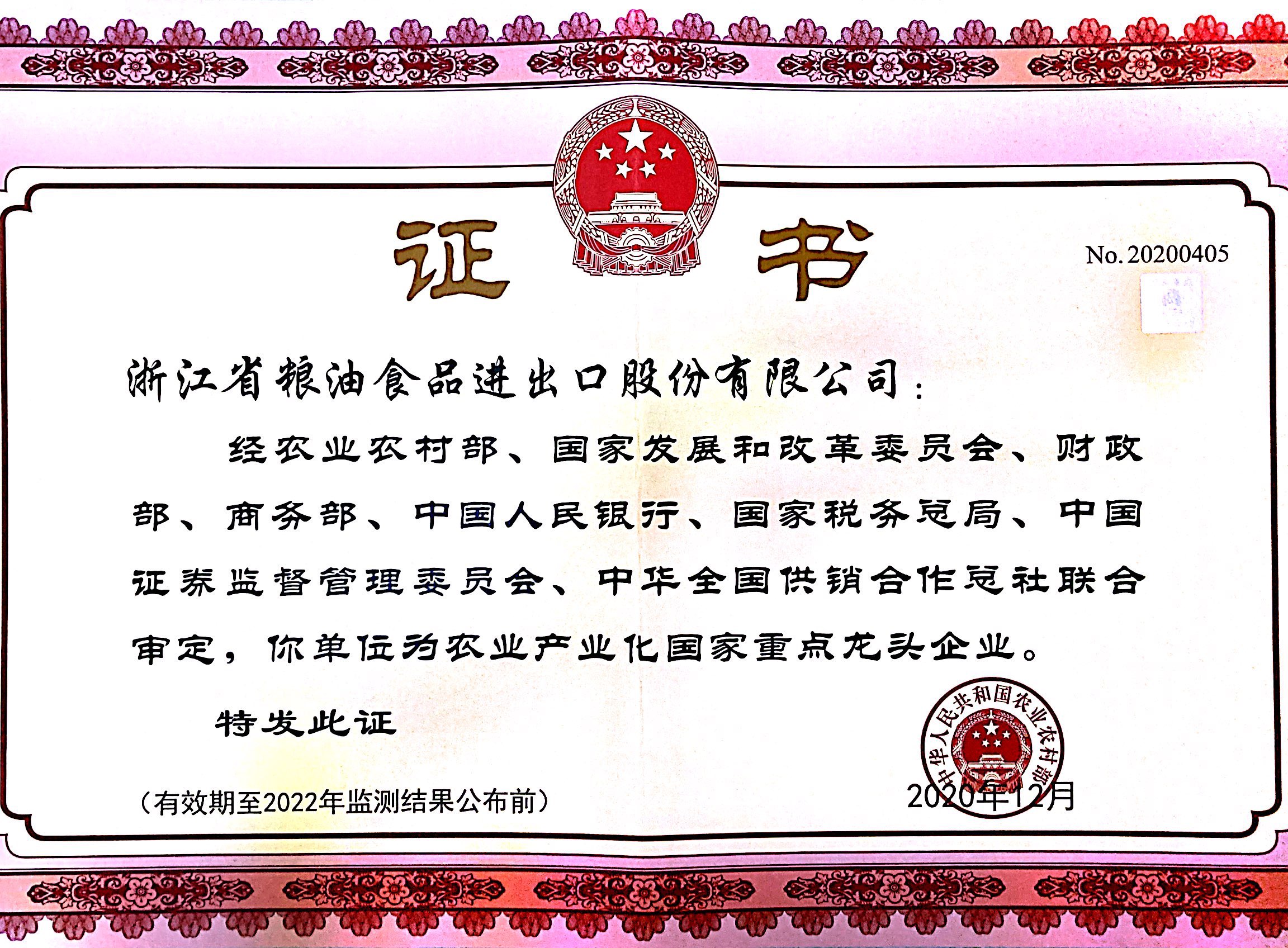 公司與寧波天韻公司通過第九次農業產業化國家重點龍頭企業監測復評